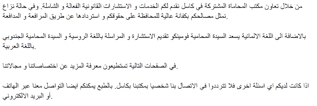 • Aufgrund ihres familiären Hintergrunds berät Rechtsanwältin Jendoubi die Mandanten in den Schwerpunkten der Kanzlei gerne auch auf Arabisch [81 KB] .